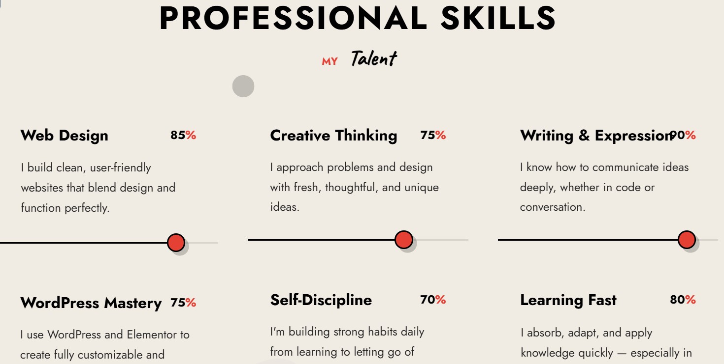 I design and build websites using WordPress and Elementor while also learning the principles of UI/UX designs. My focus is on creating functional , visually appealing, and user-friendly digital experience that works across devices.